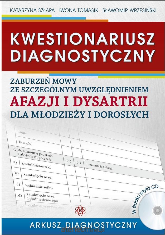 Kwestionariusz diagnostyczny... składa się z dwóch części: Arkusza diagnostycznego i Materiałów do badania. W pierwszej z nich znajdują się szczegółowo opracowane instrukcje, według których przeprowadza się badanie diagnozujące, oraz arkusz odpowiedzi pacjenta (Karta zapisu mowy pacjenta). Arkusz odpowiedzi jest skorelowany z instrukcją. Do tej części dołączona jest płyta CD, na której znajdują się nagrania dźwięków do badania gnozji słuchowej, oraz przygotowana do wydruku Karta zapisu mowy pacjenta. Część drugą stanowi materiał graficzny - zbiór 18 załączników zawierających kolorowe ilustracje, zdjęcia oraz materiał werbalny, za pomocą których przeprowadza się diagnozę.