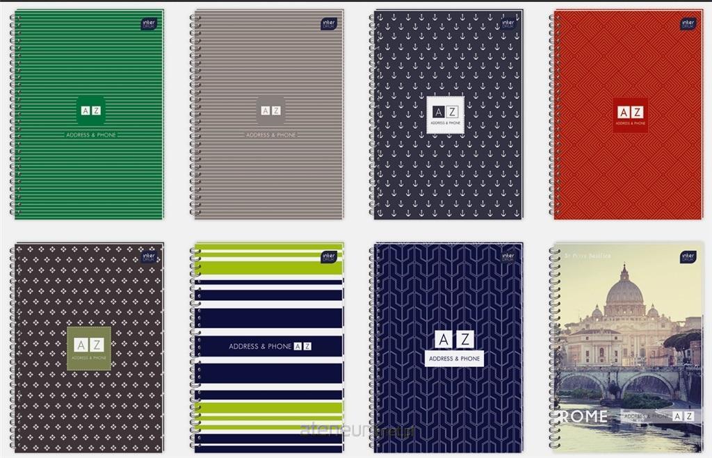 Skorowidz A6 na spirali w twardej oprawie, mix wzorów. 5 sztuk w opakowaniu zbiorczym. Producent Interdruk.