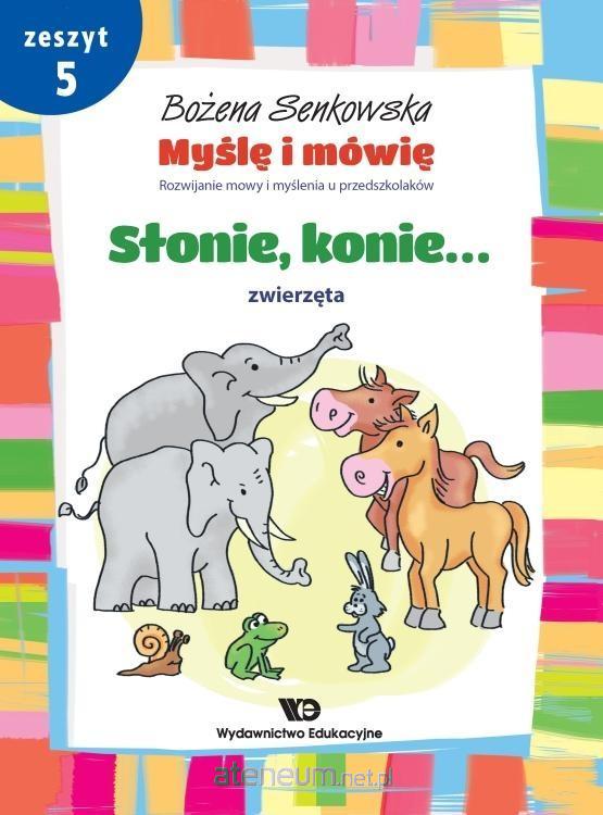 Seria zeszytów z ćwiczeniami dla dzieci w wieku od 3 do 5 lat. Zeszyty mogą być pomocne specjalistom pracującym z dziećmi w poradniach psychologiczno-pedagogicznych, nauczycielom przedszkoli, a także rodzicom. Każdy z zeszytów obejmuje inny blok tematyczny. Celem nadrzędnym wszystkich ćwiczeń jest rozwijanie jednocześnie mowy i myślenia dziecka, adekwatnie do jego możliwości poznawczych i percepcyjnych. Niektóre ćwiczenia zwracają uwagę dziecka na dźwiękową strukturę słowa (rym, długość słów). Ćwiczenia przedstawione są w kolorowej szacie graficznej, z kolei strony czarno-białe wymagają od dziecka jego twórczej aktywności. Zeszyt 5 - Słonie, konie... Zwierzęta