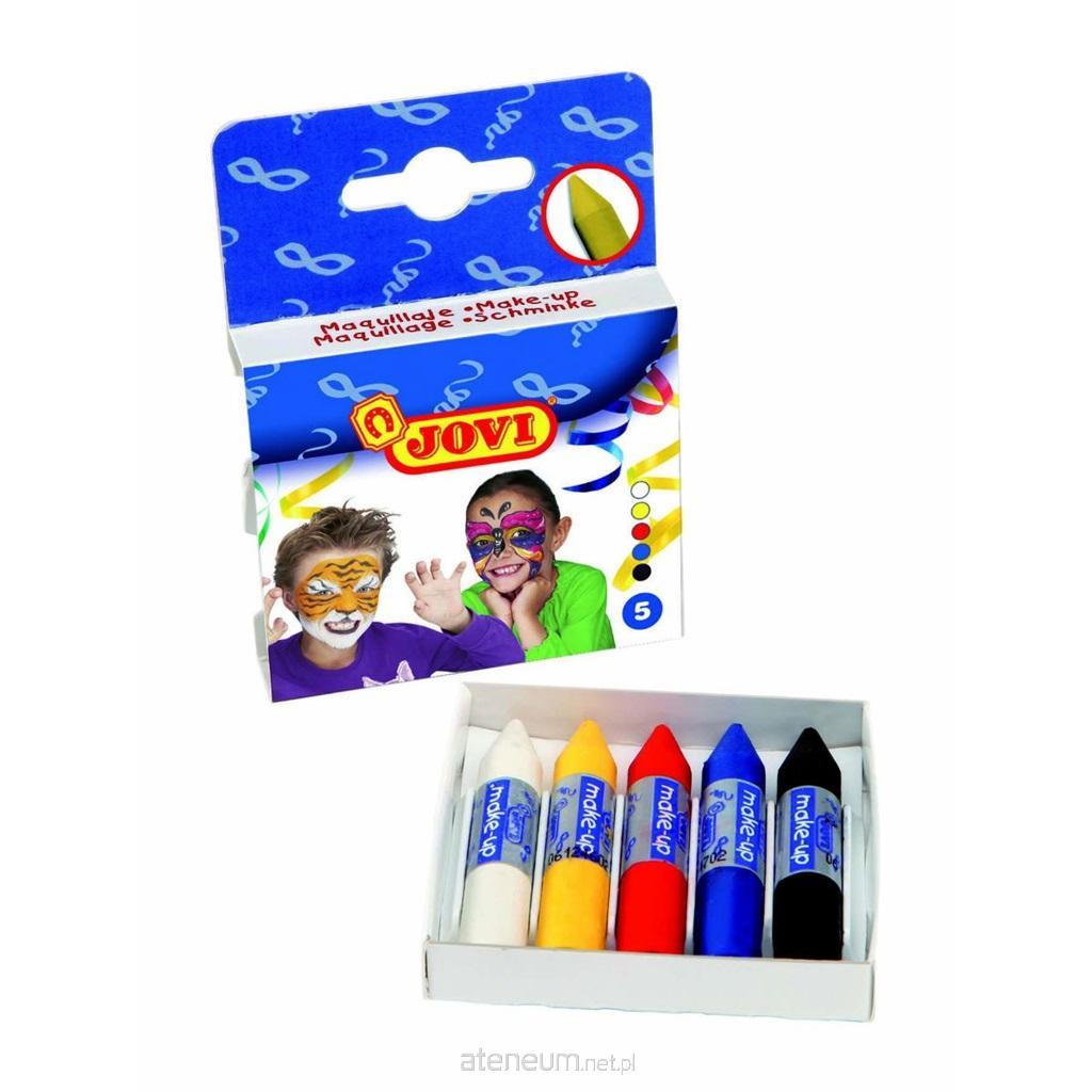 W skład zestawu wchodzi 5 małych, 3,5g kredek w kolorach: biały, żółty, czerwony, niebieski, czarny oraz praktyczne opakowanie idealne do przechowywania i przenoszenia kredek. Kredki hiszpańskiej firmy Jovi przeznaczone do malowania twarzy i ciała łatwo się rozprowadzają, trwale pokrywają skórę nawet w trakcie aktywnej zabawy i w łatwy sposób usuwają się nawilżonymi chusteczkami lub pod wpływem wody z mydłem lub mleczka kosmetycznego. Można je temperować. Kredki są bezpieczne, nietoksyczne, zawierają barwniki kosmetyczne łagodne dla skóry i posiadają atest PZH.