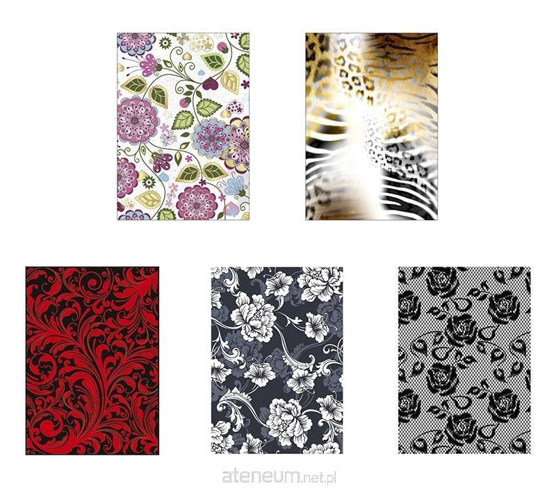 Okładka wykonana z tektury pokrytej folią. Z modnymi nadrukami. Posiada 6 wgrzanych koszulek (4 duże, 2 małe) oraz 2 kieszenie wewnętrzne. Dzięki dodatkowo wgrzanym małym kieszonką możemy również przechowywać dokumenty mniejszych rozmiarów takie jak dowód osobisty. Mix wzorów - wzór wysyłany losowo.