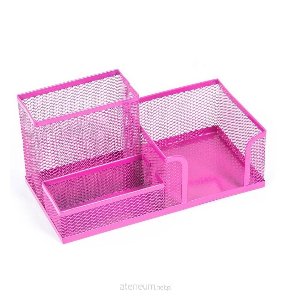 Metalowy, trzykomorowy przybornik na biurko powleczony różowym lakierem.Wymiary: 205x103x98 mm.