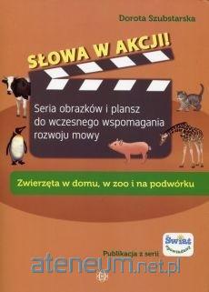 Seria obrazków i plansz do wczesnego wspomagania rozwoju mowy. Zwierzęta w domu, w zoo i na podwórku Małe dziecko nie uczy się słów. Nabywa mowę razem z wiedzą o świecie. Dlatego, aby bogacić słownikowy inwentarz, trzeba nasycić dziecko językiem zaangażowanym, czyli uczestniczącym w działaniu. Słowa w akcji to pomoc o prawie nieograniczonych możliwościach. To narzędzie, które pozwala ożywić język i nadać mu funkcje użytkowe. Połączenie obrazków, przedstawiających zwierzęta i ich młode, z uproszczonymi planszami, prezentującymi między innymi zoo, statek i bezludną wyspę, umożliwia wprowadzenie akcji, na przykład oglądanie zwierząt czy zabieranie ich w podróż. Zatem dziecko nie tylko uczy się prostego nazywania, ale bawiąc się, poznaje kolejne słowa w kontekście sytuacyjnym i gramatycznym zarazem. Publikacja stanowi twórczy sposób na wspomaganie rozwoju mowy małego dziecka.