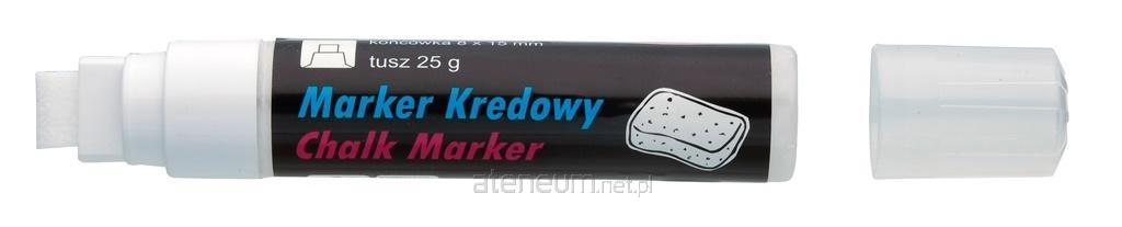 Marker z płynną kredą, do pisania po tablicach czarnych, białych, po szkle i powierzchniach plastikowych. Zmywalny wodą, jak zwykła kreda np. tradycyjną. Nasączalne końcówki fibrowe, bezwonny tusz pigmentowy, nie zawiera xylenu. Końcówka ścięta 8-5 mm, kolor biały.