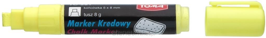 Marker z płynną kredą, do pisania po tablicach czarnych, białych, po szkle i powierzchniach plastikowych. Zmywalny wodą, jak zwykła kreda np. tradycyjną. Nasączalne końcówki fibrowe, bezwonny tusz pigmentowy, nie zawiera xylenu. Końcówka ścięta 4,45 mm, kolor żółty.