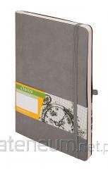 gramatura: 80 g, liczba stron: 192, okładka: twarda, materiał: skóra ekologiczna,wymiary: 145210 mm, pionowa gumka zamykająca, gumka na długopis,zaokrąglone rogi,wyklejka z czarnego papieru ozdobnego,wnętrze: kratka koperta na luźne karteczki,wstążka w kolorze okładki