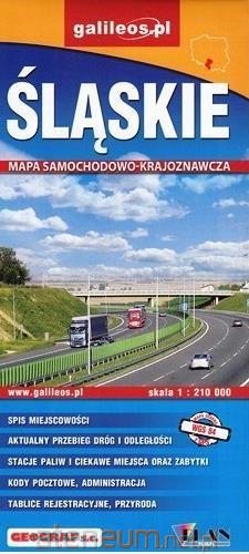 Aktualna mapa woj. śląskiego, zaznaczone atrakcje zgrupowane w szlaki tematyczne, opis wybranych atrakcji. Opracowanie kartograficzne obejmuje obszar województwa śląskiego z zaznaczonymi 15 szlakami tematycznymi (m.in. Szlak Architektury Drewnianej, Zabytków Techniki, Orlich Gniazd, Sanktuariów, Zamków i Pałaców, Śląskie Smaki, Sportu i Turystyki, Rezerwatów Przyrody, ). Szlaki te pokazano na mapie ikonami z odpowiednim numerem. Poza tym punktowo zaznaczono m.in. obiekty sakralne i pałace. Strona opisowa zawiera opis w języku polskim wybranych obiektów opisy zilustrowano fotografiami. Mapa zawiera informacje takie jak: -Spis miejscowości, -Aktualny przebieg dróg i odległości, -Stacje paliw i ciekawe miejsca oraz zabytki, -Kody pocztowe, administracja, -Tablice rejestracyjne, przyroda.