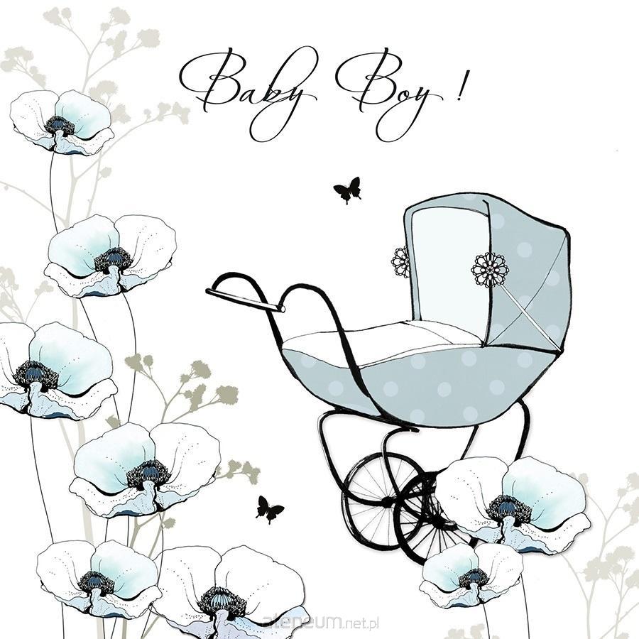 Karnet bez tekstu z kopertą, ręcznie robiony z kryształkiem Swarovski,Narodziny chłopiec wózek