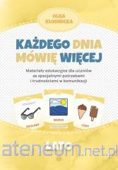 Każdego dnia mówię więcej. Materiały edukacyjne dla uczniów ze specjalnymi potrzebami i trudnościami w komunikacji Książki z serii Każdego dnia mówię więcej mogą być pomocą do codziennej terapii i zabawy zarówno dla specjalistów (logopedów, pedagogów, terapeutów), jak i dla rodziców. Zamieszczone w publikacji obrazki zostały dostosowane do specyfiki pracy z dziećmi ze specjalnymi potrzebami są odpowiednio duże, pozbawione tła i zbędnych szczegółów. Każdy obrazek jest podpisany, dzięki czemu dziecko nieświadomie zapamiętuje obraz wyrazu. Litery w podpisach są koloru czerwonego przykuwającego uwagę nawet maluchów. Zastosowano pismo bezszeryfowe, uznawane za najodpowiedniejsze dla małych dzieci lub dzieci niepełnosprawnych