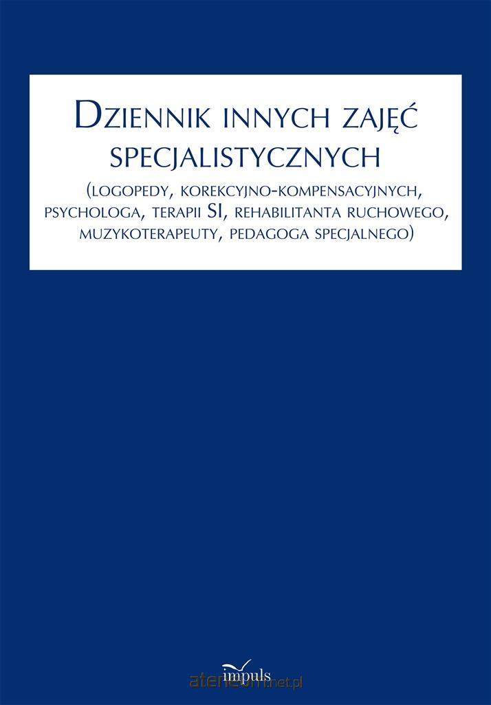 Polecamy na nowy rok Dziennik innych zajęć specjalistycznych, przeznaczony dla logopedy, korekcyjno-kompensacyjnych, psychologa, terapii SI, rehabilitanta ruchowego, muzykoterapeuty, pedagoga specjalnego. Dziennik przygotowany jest w formacie A4 ze skrzydełkiem na którym wpisujemy imiona i nazwisko objętości 140 stron na których do Państwa wykorzystania są opracowane: tygodniowy rozkład zajęć, informacje o wychowankach, wykaz obecności dzieci na zajęciach, plan pracy, podstawa zakwalifikowania na zajęcia (diagnoza), indywidualny program terapii, analiza postępów dziecka, zalecenia do dalszej pracy, realizacja programu zajęć, kontakty z rodzicami, nauczycielami, poradniami specjalistycznymi, inne, hospitacje, uwagi i notatki. Tabele dziennika opracowała Pani Anna Franczyk natomiast konsultowała Pani Agnieszka Kucharska. Podstawa prawna polecanego Dziennika to: Rozporządzenie Ministra Edukacji Narodowej z dnia 25 sierpnia 2017 r. w sprawie sposobu prowadzenia przez publiczne przedszkola, szkoły i placówki dokumentacji przebiegu nauczania, działalności wychowawczej i opiekuńczej oraz rodzajów tej dokumentacji (Dz.U. z 2017 r., poz. 1646)