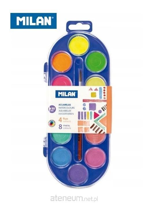 Farby akwarelowe 12 kolorów: 4 FLUO + 8 METALIZOWANYCH. Średnica pastylki 30 mm. Zawierają pędzel z włosia naturalnego zaprojektowany specjalnie do akwareli. Pokrywka stanowi jednoczesnie paletkę do mieszania farb. Żywe, intensywne kolory zachęcają dzieci do pracy. Łatwo się spierają niemal z każdej powierzchni. Farby MILAN są zgodne z europejskimi i amerykańskimi normami bezpieczeństwa. Nie zawierają ftalanów, metali ciężkich i innych substancji toksycznych. Są bezpieczne dla dzieci.