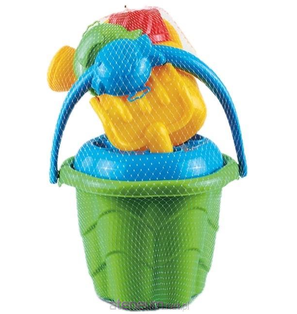 W zestawie 8 elementów: wiaderko, sitko, konewka, łopatka, grabki, 3x foremka.
