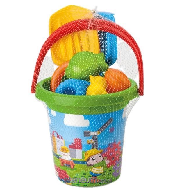 W zestawie 7 elementów: wiaderko, konewka, łopatka, grabki, 3 foremki.