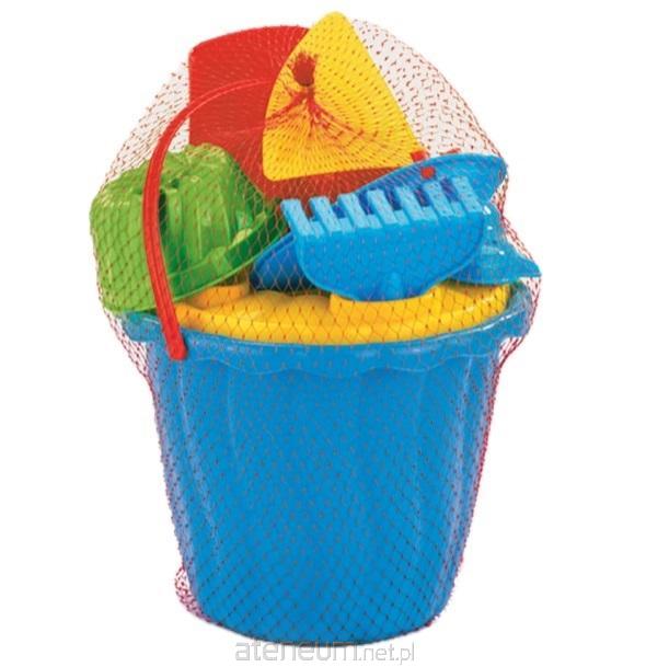 W zestawie: 8 elementów: wiaderko, sitko, łopatka, grabki, żaglówka, 3x foremki