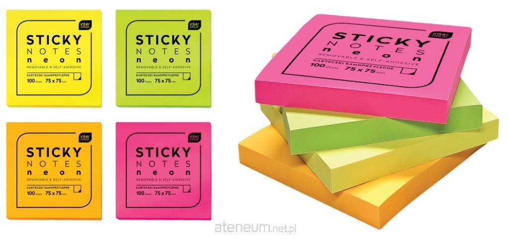 Blok karteczek samoprzylepnych w kolorach neonowych. Format: 75x75 mm. 100 szt. Mix kolorów, kolor wysyłany losowo.