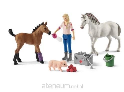 Lekarz weterynarii zabiera swój kufer lekarski do stajni i opiekuje się źrebakiem Quarter Horse. Podczas gdy ona pielęgnuje źrebię, zmienia opatrunek i słucha go stetoskopem, klacz Quarter Horse obserwuje z zainteresowaniem. Oczywiście, jest bardzo uważna, czy nic nie stanie się z jej źrebakiem. Zuchwały prosiak z gospodarstwa jest również na miejscu i korzysta z okazji, aby zjeść kilka soczystych jabłek, kiedy żaden z pozostałych nie patrzy. Po badaniu jest nagroda: butelka mleka dla źrebaka. Świetny zestaw uzupełniający do nowej stajni z 3 słodkimi zwierzętami, weterynarzem i mnóstwem akcesoriów. Wszystkie figury Schleich® są wiernie modelowane, z miłością malowane i stanowią pedagogicznie wartościową zabawę.