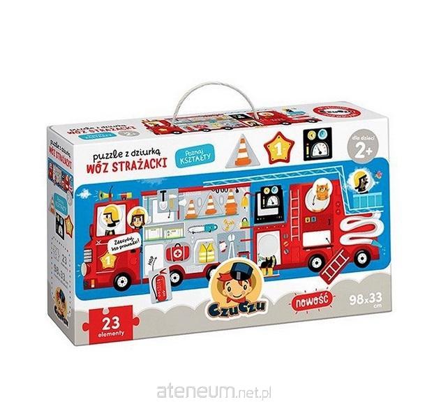 Kolorowa, wielka panoramiczna układanka przedstawia w pełni wyposażony wóz strażacki i jego dzielną załogę. Oprócz tradycyjnych puzzli ma także wyjmowane elementy, które należy dopasować do odpowiednich dziurek o różnych kształtach. Znakomicie sprawdzi się jako pierwsze wieloelementowe puzzle dla maluchów, nie tylko wielbicieli straży pożarnej. W edukacyjnym zestawie znajdziecie poradnik pełen pomysłów na różnorodne, rozwijające zabawy.