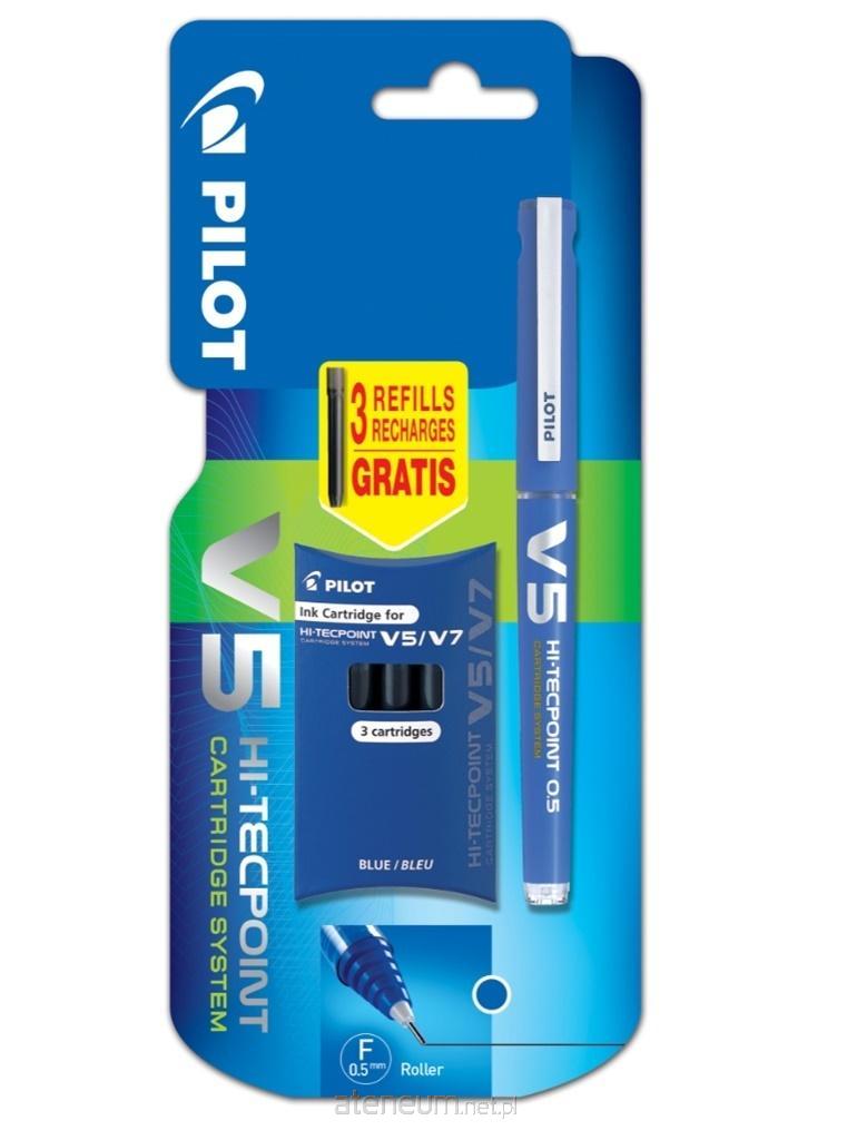 Niebieski cienkopis kulkowy V5 na blistrze, z 3 dodatkowymi, wymiennymi nabojami, o rozmiarze końcówki piszącej 0.5. Pierwszy cienkopis z wymiennymi nabojami! Legendarna precyzja cienkopisów V5 zamknięta w jeszcze bardziej ekonomicznym opakowaniu. Posiada obudowę w kolorze atramentu, z okienkiem pozwalającym na kontrolę zużycia tuszu i igłową końcówkę. Jest produktem ekologicznym, idealnym również dla osób leworęcznych.