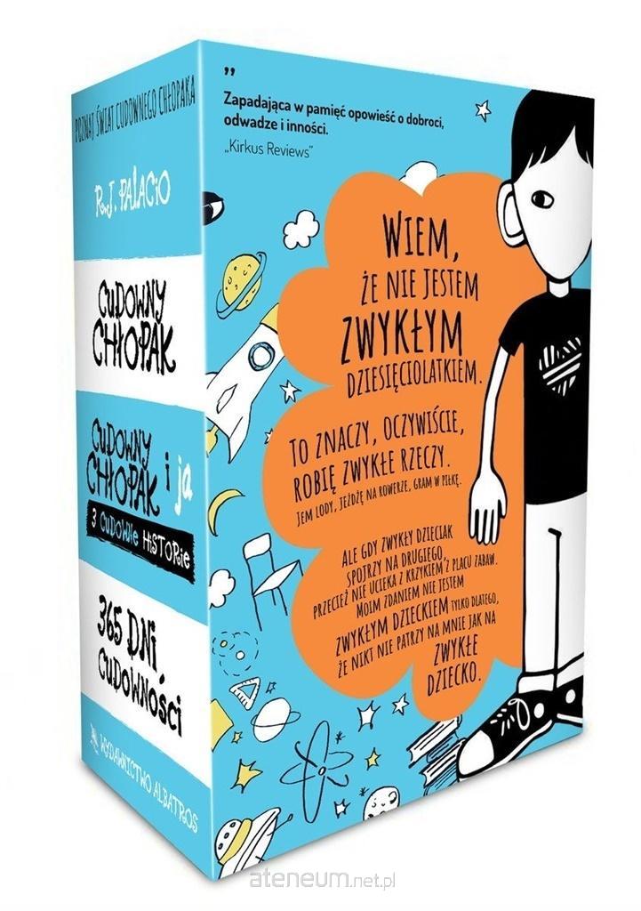 August jest inteligentnym, dowcipnym chłopcem i jego życie wyglądałoby pewnie zupełnie inaczej, gdyby nie jeden zmutowany gen, z powodu którego ma zdeformowaną twarz i zanim skończył 10 lat, musiał przejść 27 operacji. Do tej pory patrzył na siebie oczami bezwarunkowo kochających go rodziców i siostry. Teraz, gdy idzie do szkoły od razu do piątej klasy przyjdzie mu się zmierzyć ze światem rówieśników i starszych uczniów, z ostracyzmem, uprzedzeniami, a czasem ze zwykłym chamstwem i podłością. Spotka się jednak również z dobrocią, przyjaźnią i wspaniałomyślnością. Kontakt z rówieśnikami odmieni Augusta. Ale czy tylko jego? CUDOWNY CHŁOPAK I JA. TRZY CUDOWNE HISTORIE KAŻDY Z NAS MARZY O TYM, BY ZOSTAĆ ZAUWAŻONYM I BY INNI LUBILI NAS TAKIMI, JACY JESTEŚMY! Auggie w ciągu roku szkolnego zmienił życie nie tylko swoje, ale i wszystkich wokół kolegów, nauczycieli, rodziców. Jego historia uczy tolerancji i życzliwego podejścia do innych, przestrzega przed uprzedzeniami. Cudowny chłopak i ja. Trzy cudowne historie to inna strona opowieści o Auggiem. Pozwala spojrzeć na jego świat z nowych punktów widzenia: przyjaciela z dzieciństwa, szkolnego rozrabiaki i najpopularniejszej dziewczyny w klasie. Każdy z nich miał swoje powody, by zachowywać się wobec Auggiego tak, a nie inaczej. Trzy cudowne historie pokazują, że i ich niełatwo oceniać. 365 DNI CUDOWNOŚCI To zachęcające do szlachetnego działania cytaty na każdy dzień roku, dotyczące odwagi, przyjaźni, miłości i życzliwości. Znajdziemy wśród nich słowa popularnych piosenek, cytaty z książek dla dzieci, epitafia z egipskich nagrobków i sentencje z ciasteczek z wróżbą. Inspiracją do stworzenia księgi złotych myśli stała się postać znanego z CUDOWNEGO CHŁOPAKA i uwielbianego przez uczniów profesora Browne'a.