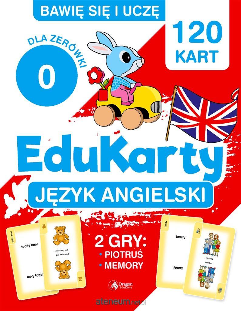 EduKarty. Język angielski to pomoc w nauce słownictwa języka angielskiego dla dzieci w klasach od zerówki do trzeciej. Zestaw przeznaczony jest do nauki w domu, w szkole i podczas kursów językowych. Zakres słownictwa obejmuje takie tematy jak części ciała, zabawki, szkoła, liczby, kolory czy pogoda. Zestaw zawiera: 120 kart, w tym 60 kart ze słówkami i 60 kart z ilustracjami. EduKarty zawierają także specjalny zestaw ćwiczeń-zabaw, które trenują mózg, aby lepiej się uczyć i łatwiej zapamiętywać materiał. 1 stronę z opisem gier i słowniczkiem