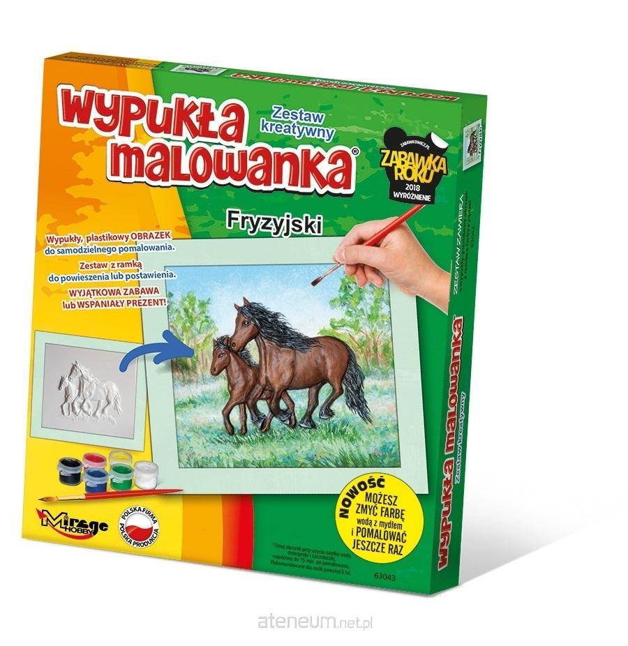 Wypukła Malowanka od Mirage Hobby to Zestaw Kreatywny do malowania dla osób powyżej 5. roku życia. Zestaw zawiera wypukły, plastikowy, kształtny obrazek 3D, farbki akrylowe, pędzelek oraz ramkę z kartonu do postawienia lub powieszenia. Zmyj obrazek przy użyciu ciepłej wody, mydła i szczoteczki, najpóźniej do 15 min. po pomalowaniu. Obrazek ma odpowiedni do wzoru wypukły kształt 3D, który jest dobrze odczuwalny w dotyku. Produkt jest wymyślony i wyprodukowany w Polsce! Wszelkie prawa zastrzeżone. Każda Wypukła Malowanka to konkretny wzór z danej serii. Kolekcja jest podzielona na różne serie np. Koty, Psy, Konie, Futrzaki, Dinozaury, Jednorożce, Kwiaty, Sport, Bajki, Zoo, Las, Taniec i inne. Seria Wypukła Malowanka Zestaw Kreatywny została nagrodzona Wyróżnieniem Zabawka Roku 2018.