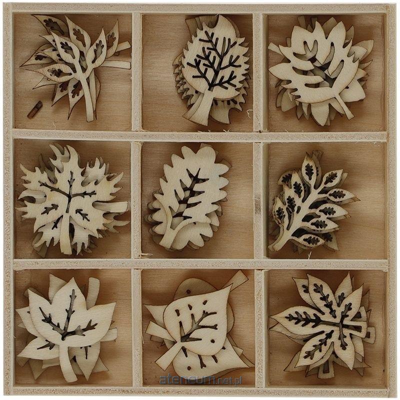 Drewniane dekoracje w drewnianym pudełku 105x105mm naturalne9 wzorów x 5szt. liście sklejka 1mm 45szt.