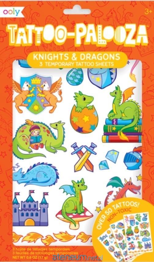 Wyraź się za pomocą zmywalnych tatuaży! Zestaw tymczasowych tatuaży Smoki i Rycerze zawiera 3 arkusze wzorów; to ponad 50 tatuaży z kolorowymi, bajkowymi motywami w jednym zestawie! Tymczasowe tatuaże OOLY są łatwe w aplikacji, utrzymują się do 5 dni, są łatwe do usunięcia i oczywiście są nietoksyczne. Rycerze, zamki i oczywiście smoki to tematyka typowo bajkowa. Zestaw tatuaży Tattoo Palooza - Smoki i Rycerze zawiera 3 wesołe, tymczasowe arkusze tatuaży wypełnione uroczymi i kolorowymi smokami, mieczami i tarczami. To ponad 50 tatuaży przedstawiających średniowieczną zabawę. Te tymczasowe tatuaże są łatwo się nakleją, a utrzymują się do 5 dni. Zabawne tymczasowe tatuaże o tematyce bajkowo-średniowiecznej 3 arkusze tatuaży - ponad 50 wzorów Łatwe do nałożenia Rozmiar jednego arkusza: 13,2 x 20,8 cm Utrzymują się do 5 dni Przy zabawie zalecany jest nadzór osoby dorosłej Odpowiednie dla dzieci w wieku od 3 lat Nietoksyczne