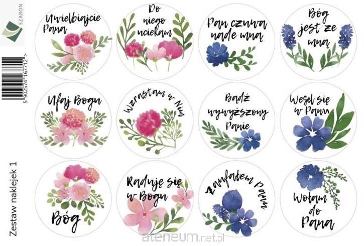 Zestaw naklejek z chrześcijańskimi hasłami w otoczeniu kolorowychkwiatów.12 naklejek z tekstami np.Wołaj do PanaPan czuwa nade mnąDo Niego uciekamBóg jest ze mną