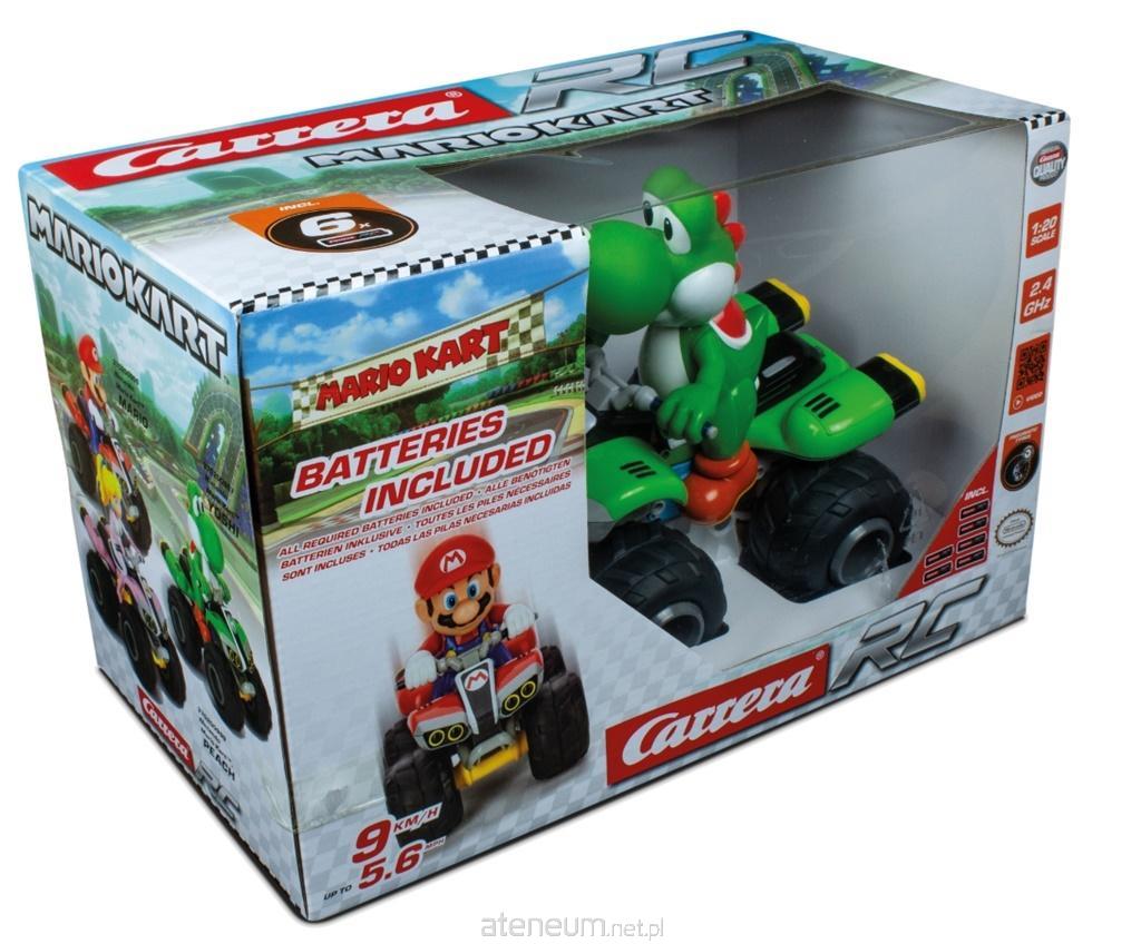 Pojazd quad na licencji Nintendo: Yoshi, w technologii 2,4 GHz, gumowe opony, full-function sterowanie naprzód/stop/ wstecz oraz w lewo/prosto/w prawo, karoseria ze tworzywa sztucznego: elastyczna i lekka, do zabawy wewnątrz i na zewnątrz, ładowanie USB, akumulator LiFePO4 3.2V 700 mAh, skala 1:20, czas ładowania: ok. 50 min, czas zabawy: 30 min, prędkość: max. 9 km/h, długość samochodu: ok. 19 cm, baterie do kontrolera: 2 x AAA (w zestawie), wiek 6+.