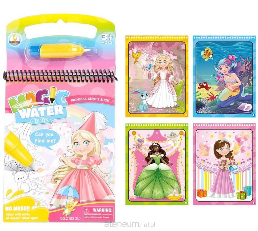 Książeczka do samodzielnego złożenia. Książeczka wielokrotnego wykorzystania. Strony kolorujemy pisaczkiem napełnionym wodą. Obrazek po zestknięciu z wodą nabiera barw. Po wyschnięciu ponownie strona jest do użytku. 4 karty Wzór - księżniczki Wiek: 3+