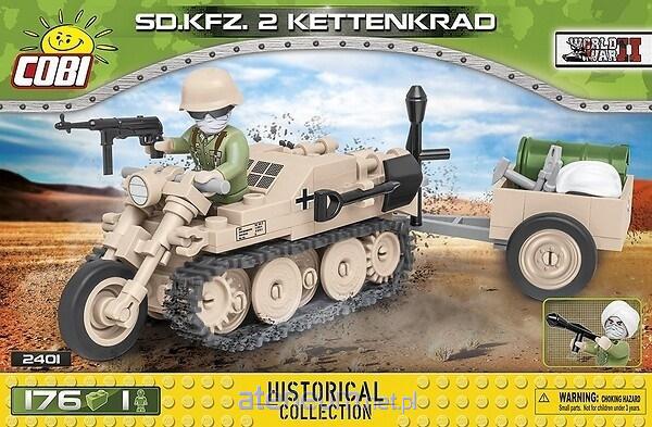 Model Sd.Kfz.2 Kettenkrad został w całości zaprojektowany z klocków konstrukcyjnych COBI. Zastosowanie aż 176 klocków umożliwiło wiernie odtworzenie nie tylko samego pojazdu, ale również przyczepki wypełnionej zaopatrzeniem. Zestaw nie zawiera naklejek. Klocki zostały pokryte wysokiej jakości nadrukami, które nie ścierają się nawet w trakcie intensywnego użytkowania. Do zestawu została dołączona figurka niemieckiego żołnierza w mundurze Afrika Korps. Rewelacyjna, uniwersalna główka z nadrukiem chusty na twarzy z pewnością znajdzie wiele zastosowań wśród fanów klocków COBI. Całość zestawu uzupełnia długa lista akcesoriów takich jak narzędzia, uzbrojenie, nakrycia głowy oraz specjalny klocek z nadrukowaną nazwą pojazdu. Ciekawostką jest uchylna klapa, pod którą znajduje się piękny nadruk silnika. Zestaw idealnie sprawdzi się przy budowie dioram odtwarzających zmagania w Afryce Północnej, Europie Wschodniej i Zachodniej. Zestaw Kettenkrad to doskonały pomysł na prezent dla każdego niezależnie od wieku fana militariów oraz doskonały powód do rozpoczęcia przygody z klockami konstrukcyjnymi COBI.