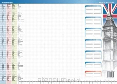 Podkład na biurko (biuwar) dla ucznia w formacie A3 Irregular verbs. Na podkładzie znajduje się tabelka z najważniejszymi czasownikami nieregularnymi języka angielskiego: forma czasu teraźniejszego, formy przeszłe oraz tłumaczenie, miejsce na notatki i linijka.