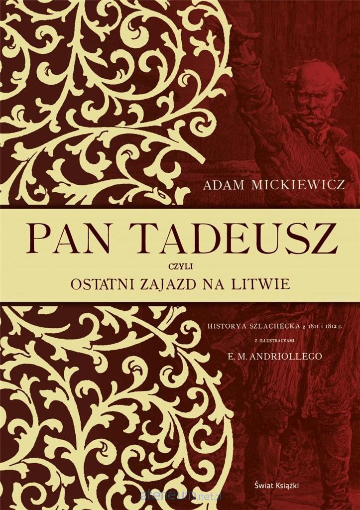 Pan Tadeusz czyli Ostatni zajazd na Litwie. Historya szlachecka z 1811 i 1812 r. Reprint wydania z 1882 roku we Lwowie, które ukazało się nakładem Księgarni Hermana Altenberga. Epopeja narodowa opowiadająca dzieje skonfliktowanych rodów szlacheckich Sopliców i Horeszków. Elegancka, unikatowa edycja w twardej oprawie z licznymi ilustracjami Michała Elwiro Andriollego. Materiały archiwalne wykorzystano dzięki uprzejmości Biblioteki Narodowej.