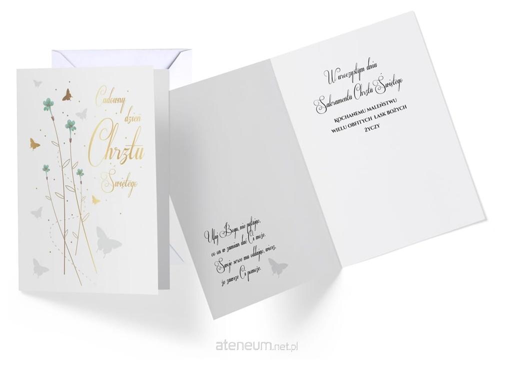 Karnet Vision "Chrzest" w powiększonym tzw. Angielskim formacie 140x190 mm. Wykonane z niezwykłą dbałością o szczegóły, zdobione folią holograficzną i w całości pokryte folią matową dla podkreślenia efektu prostoty i elegancji. Wewnątrz znajduje się tekst życzeń, a całość uzupełnia dedykowana biała koperta.