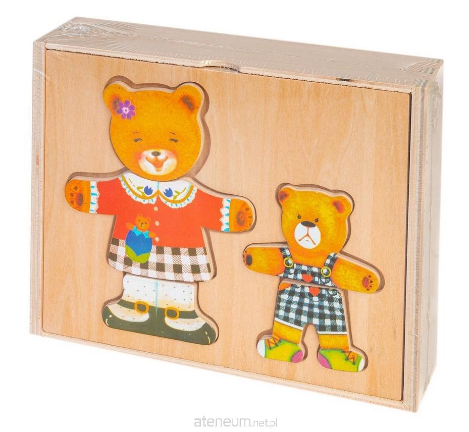 Drewniane puzzle to 2 wesołe misie do układania. Można zmienić im nastrój lub ubranie. Wszystkie elementy umieszczone są w drewnianym pudełku, co ułatwia utrzymanie zabawki w porządku po skończonej zabawie. Pudełko ma również funkcję formy na której układamy odpowiednie elementy. Zestaw składa się aż z 30 elementów.