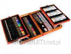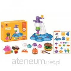 Zestaw masy plastycznej MAKARON. Zestaw zawiera 3 kubki z masą, maszynkę do robienia makaronu, 4 formy do różnych kształtów makaronu, miska, nożyk, łyżka, widelec, talerzyk.