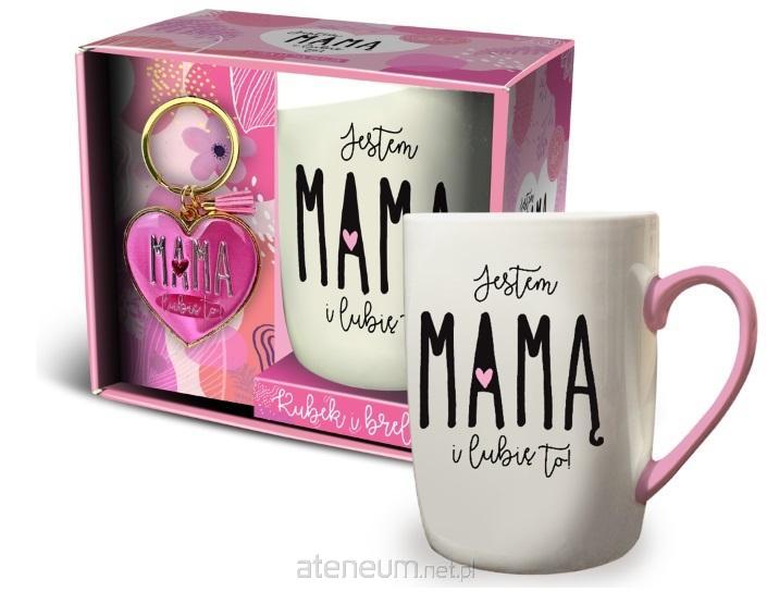 Zestaw zawierający ceramiczny kubek i brelok zapakowane w eleganckie pudełko.