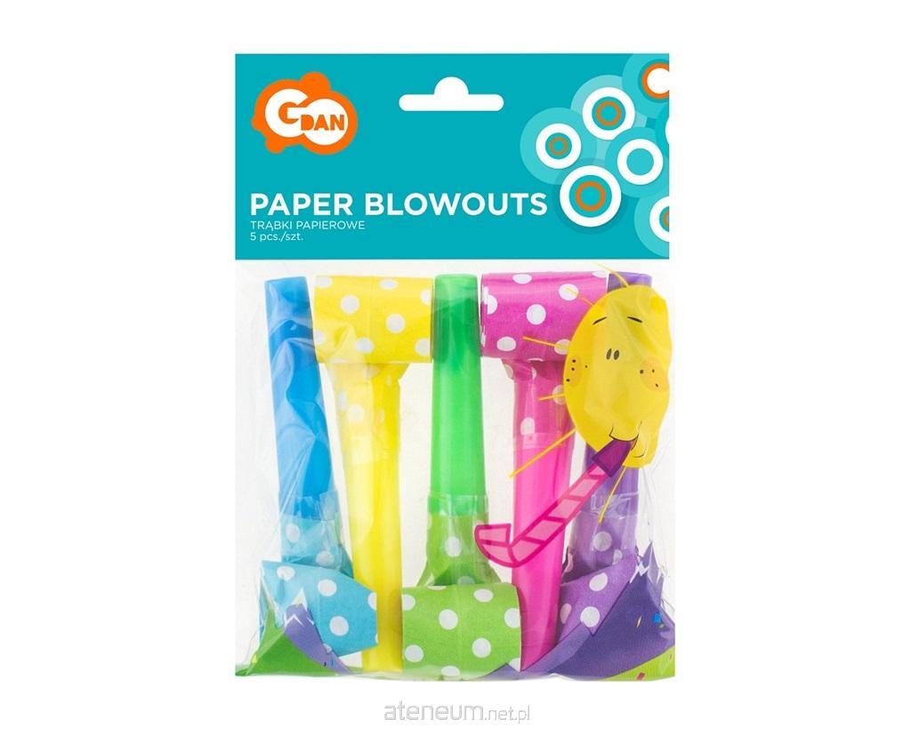 Zestaw "5 trąbek w groszki" Zestaw zawiera 5 sztuk trąbek różnokolorowych w białe grochy Materiał: papier i plastik Każda trąbka posiada plastikowy ustnik