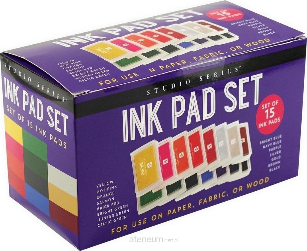 Zestaw 15 kolorowych poduszek do stempli/pieczątek firmy Peter Pauper Press. Każda podkładka jest nasączona wysokiej jakości tuszem oraz posiada zamknięcie zapobiegające wysychaniu. Pasuje różnego rodzaju stempli i pieczątek. Do użytku na papierze, tkaninie czy drewnie. Idealny do scrapbookingu, planerów, tworzenia pocztówek, laurek, ozdabiania notesów, albumów, boullet journaling, do uwidaczniania tłoczeń, postarzania/przyciemniania papieru i wszelkiego rodzaju rękodzieła. 15 kolorów: żółty, pomarańczowy, ceglasty, łososiowy, różowy, jasnozielony, ciemnozielony, zielony, jasnoniebieski, granatowy, fioletowy, srebrny, złoty, brązowy, czarny.