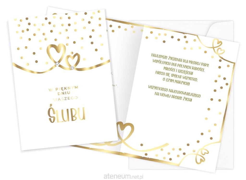 W powiększonym tzw. Angielskim formacie 140x190 mm. Wykonana z niezwykłą dbałością o szczegóły, zdobiona złotą, matową folią oraz lakierem UV dla podkreślenia wyjątkowości i elegancji. Wewnątrz znajduje się tekst życzeń, a całość uzupełnia dedykowana biała koperta. okazja: Ślub