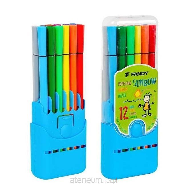 Zestaw 12 kolorowych markerów w plastikowym pudełku, żywe i intensywne kolory, tusz na bazie wody, zmywalny z większości tekstyliów, szerokość toru 1-2 mm, długość pisania ok. 200 m.
