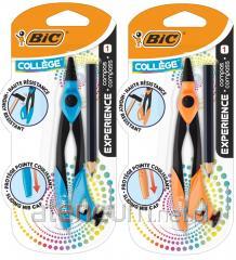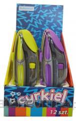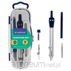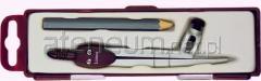 9-elementowy, w metalowym pudełku, zawierający: 2 metalowe cyrkle w kolorze granatowo-zielonym - jeden z uniwersalnym uchwytem na ołówek, a drugi na grafity o grubości 2 mm; linijkę; 2 ekierki; kątomierz; gumkę; ołówek i temperówkę.