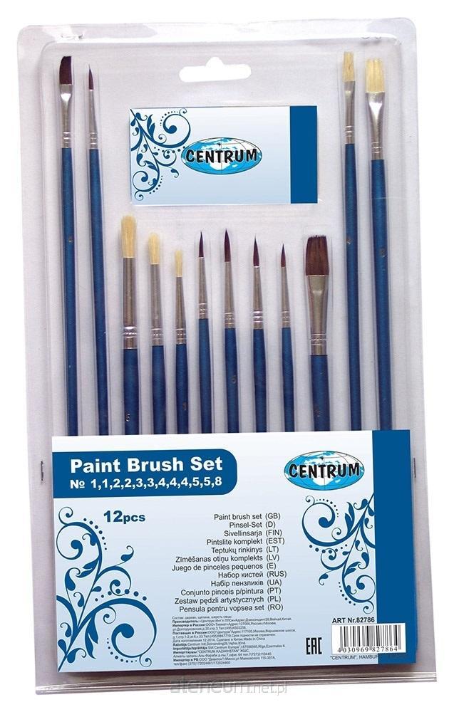 Zestaw 12 drewnianych pędzli w przezroczystym plastikowym opakowaniu.