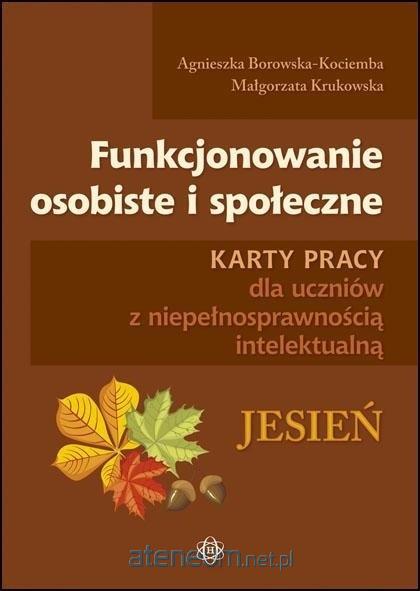 Funkcjonowanie osobiste i społeczne. Karty pracy dla uczniów z niepełnosprawnością intelektualną. Teczka 1: JESIEŃ to propozycja pomocy dydaktycznej dla nauczycieli, pedagogów i terapeutów pracujących z uczniami niepełnosprawnymi intelektualnie w stopniu umiarkowanym i znacznym, ze sprzężeniami oraz z dziećmi mającymi trudności w uczeniu się. Karty mogą być wykorzystywane przez rodziców do pracy z dziećmi w domu w celu podtrzymania ciągłości procesu edukacyjnego, a także jako urozmaicenie codziennych zajęć. Zarówno układ, jak i treść ćwiczeń odpowiadają rozkładowi materiału nauczania dla uczniów z niepełnosprawnością intelektualną i są zgodne z podstawą programową MEN z 23 grudnia 2008 roku.