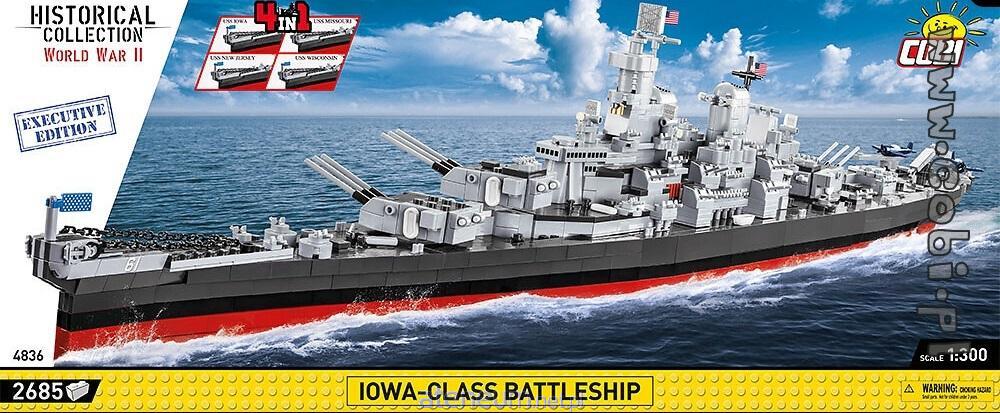 Najsłynniejsze na świecie, ogromne amerykańskie pancerniki klasy Iowa w jednym zestawie EXECUTIVE EDITION! To Ty decydujesz, który z czterech istniejących okrętów chcesz zbudować! W pudełku znajdziesz klocki z indywidualnymi oznaczeniami okrętów, klocki umożliwiające zmiany konstrukcyjne oraz komplet czterech ekskluzywnych, czarnych tabliczek z nazwami!