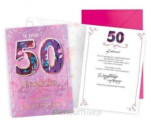 Karnet Dream Cards Plus "Urodziny 50-latki" DKP-023 w powiększonym tzw. Angielskim formacie 140x190 mm. Kartka z ozdobnej serii Dream Cards Plus na pięćdziesiąte urodziny robi wrażenie dzięki atrakcyjnej kolorystyce i ciekawym zdobieniom. To idealny wybór łączący przyjazną cenę z jakością. Cechy szczególne: wielkość: 145 x 195 cm po złożeniu kopertą, wnętrze: kolorowe, wyjątkowe życzenia w środku, w komplecie: dopasowana kolorystycznie koperta. zdobienia: różnorodne, bogate (w zależności od wzoru: przyklejane dekoracje, elementy biżuteryjne, odstawniki, brokat, metaliczne folie, tłoczenia itp.), okazja: urodziny, 50 urodziny