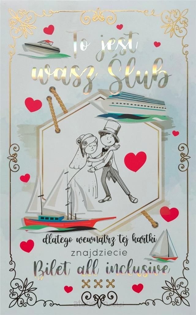 Karnet 5k z biletem to wyjątkowy pomysł na sprawienie młodej parze wesołej i niebanalnej niespodzianki. Wykonane z wysokiej jakości grubego papieru o gramaturze 350g i uszlachetnione złoceniem oraz tłoczeniem i brokatem. Oryginalne i wesołe teksty zaskoczą parę młodą i z pewnością wywołają uśmiech na ich twarzach. Karnet może być idealnym dodatkiem do każdego prezentu. Karnet zawiera również humorystyczne życzenia.