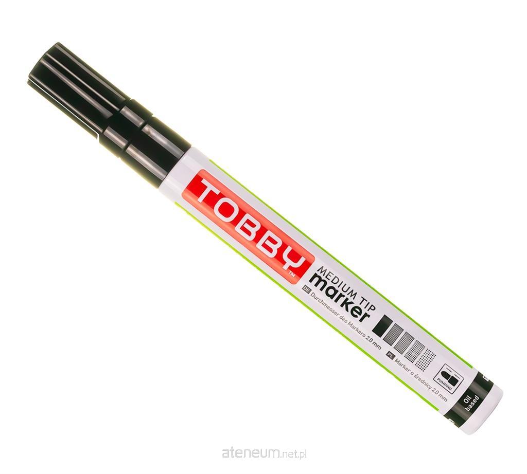 Permanentny Marker olejowy TOBBY Kolor: czarny Wodoodporny i szybkoschnący tusz na bazie alkoholi. Bez problemu możemy nim pisać po powierzchniach ze stali, gumy, szkła, drewna, plastiku itp. Cechy: - Przeznaczony do stali, gumy, drewna, plastiku, szkła i innych powierzchni - Dobrze kryjący, trwały, niezmywalny wodą, nieblaknący, odporny na różne warunki atmosferyczne (woda, promienie UV) - Okrągła końcówka 2,0 mm - Marker olejny (lakierowy) posiada pompkę do tuszu, którą, przed pierwszym użyciem, należy pompować, aż spłynie tusz, (po wcześniejszym mocnym wstrząśnięciu markera)