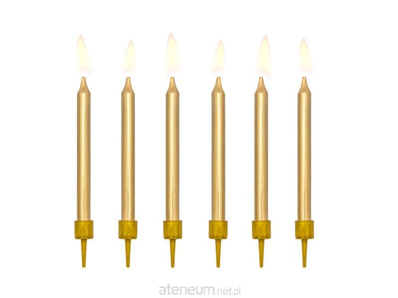 Świeczki urodzinowe gładkie w kolorze złotym metalizowanym, rozmiar ok. 6 cm, w zestawie 6 świeczek i 6 podstawek.(1 op. / 6 szt.)