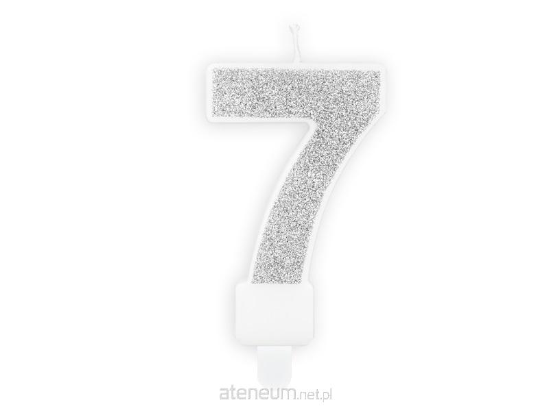 Świeczka urodzinowa Cyferka 7 w kolorze srebrnym brokatowym, rozmiar ok. 7 cm.
